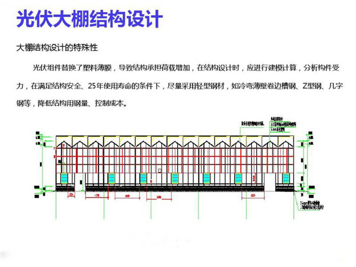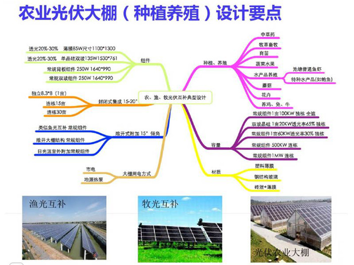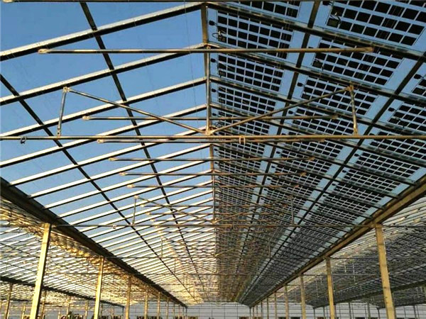 光伏農業(yè)大棚是集太陽能光伏發(fā)電、智能溫控系統(tǒng)、現(xiàn)代高科技種植為一體的溫室大棚,大棚采用鋼制骨架,上覆蓋太陽能光伏組件,同時保證太陽能光伏發(fā)電和整個溫室大棚農作物的采光需求。太陽能光伏所發(fā)電量,可以支持大棚的灌溉系統(tǒng),對植物進行補光、解決溫室大棚冬季供暖需求,提高大棚溫度,促使農作物快速生長。